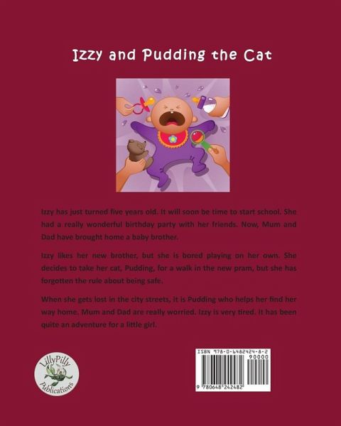 Izzy has just turned five years old. It will soon be time to start school. She had a really wonderful birthday party with her friends. Now, Mum and Dad have brought home a baby brother. Izzy likes her new brother, but she is bored playing on her own. She decides to take her cat, Pudding, for a walk in the new pram, but she has forgotten the rule about being safe. When she gets lost in the city streets, it is Pudding who helps her find her way home. Mum and Dad are really worried. Izzy is very tired. It has been quite an adventure for a little girl.