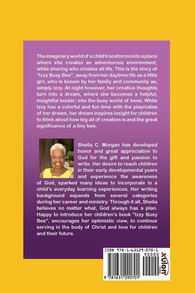 The imaginary world of a child transforms into a place where she creates an adventurous environment, while sharing who creates all life. This is the story of "Izzy Busy Bee", away from her daytime life as a little girl, who is known by her family and community as, simply Izzy. At night however, her creative thoughts turn into a dream, where she becomes a helpful, insightful leader; into the busy world of bees. While Izzy has a colorful and fun time with the playmates of her dream, her dream inspires insight for children to think about how big all of creation is and the great significance of a tiny bee. Sheila C. Morgan has developed honor and great appreciation to God for the gift and passion to write. Her desire to reach children in their early developmental years and experience the awareness of God, sparked many ideas to incorporate in a child's everyday learning experiences. Her writing background expands from several categories during her career and ministry. Through it all, Sheila believes no matter what, God always has a plan. Happy to introduce her children's book "Izzy Busy Bee", encourages her optimistic view, to continue serving in the body of Christ and love for children and their future.