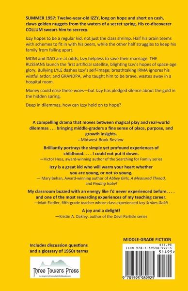 SUMMER 1957: Twelve-year-old IZZY, long on hope and short on cash, claws golden nuggets from the waters of a secret spring. His co-discoverer COLLUM swears him to secrecy. Izzy hopes to be a regular kid, not just the class shrimp. Half his brain teems with schemes to fit in with his peers, while the other half struggles to keep his family from falling apart. MOM and DAD are at odds, Izzy helpless to save their marriage. THE RUSSIANS launch the first artificial satellite, blighting Izzy's hopes of space-age glory. Bullying LYLE dashes Izzy's self-image; breathtaking IRMA ignores his wistful ardor; and GRANDPA, who taught him to be brave, wastes away in a hospital room. Money could ease these woes-but Izzy has pledged silence about the gold in the hidden spring. Deep in dilemmas, how can Izzy hold on to hope? Includes discussion questions and glossary of 1950 terms