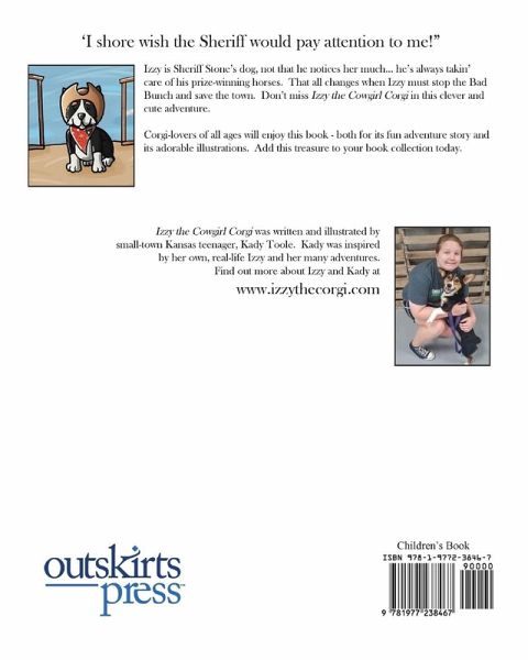 Enjoy the adventures of Izzy, the adorable and clever corgi. Izzy is the sheriff's dog and will do whatever it takes to protect her town from those pesky varmints, the Bad Bunch. This clever and fun story for corgi lovers will tickle your funnybone while the adorable and colorful illustrations will keep you coming back to these pages again and again. Izzy the Cowgirl Corgi is written and illustrated by teenager Kady Toole who is inspired by the real life adventures of her own cowboy corgi, Izzy. Reviews: "I love Izzy because she saved the day and was the hero." - Carter, age 6 "This book was soooo good. Izzy was my favorite and soooo cute!: Colton, age 8 "Great story with awesome pictures and fun characters! " - Leah, age 9 "A fun story about a cute corgi with a wiggly, butt-nub tail!" - Kamryn, age 10 "The illustrations are great... the funniest part was the horses getting pedicures!" - Cayden, age 11 "Super cute! I loved the detailed pictures and creative dialogue." Maddie, age 14 "My grandchildren love this book! I can't wait for another Izzy book!: Deloris, age 73