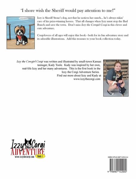 Enjoy the adventures of Izzy, the adorable and clever corgi. Izzy is the sheriff's dog and will do whatever it takes to protect her town from those pesky varmints, the Bad Bunch. This clever and fun story for corgi lovers will tickle your funny bone while the adorable and colorful illustrations will keep you coming back to these pages again and again. Izzy the Cowgirl Corgi is written and illustrated by teenager Kady Toole who is inspired by the real life adventures of her own cowboy corgi, Izzy. Find out more about this first book in the Izzy the Corgi Adventure series and all additional books from author and illustrator Kady Toole at www.izzythecorgi.com