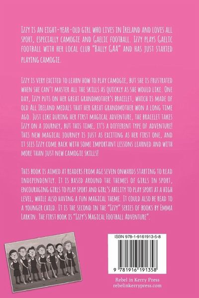 Izzy is an eight-year-old girl who lives in Ireland and loves all sport, especially camogie and Gaelic football. Izzy plays Gaelic football with her local club "Bally GAA" and has just started playing camogie. Izzy is very excited to learn how to play camogie, but she is frustrated when she can't master all the skills as quickly as she would like. One day, Izzy puts on her great grandmother's bracelet, which is made of old All Ireland medals that her great grandmother won a long time ago. Just like during her first magical adventure, the bracelet takes Izzy on a journey, but this time, it's a different type of adventure! This new magical journey is just as exciting as her first one, and it sees Izzy come back with some important lessons learned and with more than just new camogie skills! This book is aimed at readers from age seven onwards starting to read independently. It is based around the themes of girls in sport, encouraging girls to play sport and girl's ability to play sport at a high level, while also having a fun magical theme. It could also be read to a younger child. It is the second in the "Izzy" series of books by Emma Larkin. The first book is "Izzy's Magical Football Adventure".