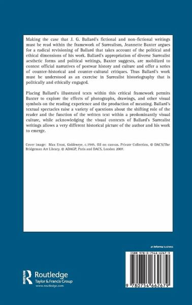 Making the case that J. G. Ballard's fictional and non-fictional writings must be read within the framework of Surrealism, Jeannette Baxter argues for a radical revisioning of Ballard that takes account of the political and ethical dimensions of his work. Ballard's appropriation of diverse Surrealist aesthetic forms and political writings, Baxter suggests, are mobilised to contest official narratives of postwar history and culture and offer a series of counter-historical and counter-cultural critiques. Thus Ballard's work must be understood as an exercise in Surrealist historiography that is politically and ethically engaged. Placing Ballard's illustrated texts within this critical framework permits Baxter to explore the effects of photographs, drawings, and other visual symbols on the reading experience and the production of meaning. Ballard's textual spectacles raise a variety of questions about the shifting role of the reader and the function of the written text within a predominantly visual culture, while acknowledging the visual contexts of Ballard's Surrealist writings allows a very different historical picture of the author and his work to emerge.