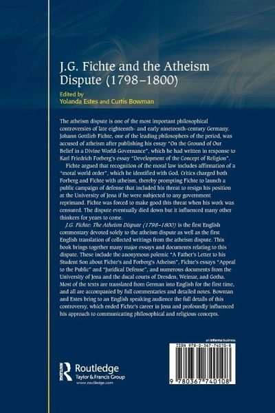 The atheism dispute is one of the most important philosophical controversies of late eighteenth and early nineteenth century Germany. Johann Gottlieb Fichte, one of the leading philosophers of the period, was accused of atheism after publishing his essay 'On the Ground of Our Belief in a Divine World-Governance', which he had written in response to Karl Friedrich Forberg's essay 'Development of the Concept of Religion'. Fichte argued that recognition of the moral law includes affirmation of a 'moral world order', which he identified with God. Critics charged both Forberg and Fichte with atheism, thereby prompting Fichte to launch a public campaign of defense that included his threat to resign his position at the University of Jena if he were subjected to any government reprimand. Fichte was forced to make good this threat when his work was censured. The dispute eventually died down but it influenced many other thinkers for years to come. J. G. Fichte: The Atheism Dispute (1798-1800) is the first English commentary devoted solely to the atheism dispute as well as the first English translation of collected writings from the Atheism Dispute. This book brings together many major essays and documents relating to this dispute. These include the anonymous polemic 'A Father's Letter to his Student Son about Fichte's and Forberg's Atheism', Fichte's essays 'Appeal to the Public' and 'Juridical Defense', and numerous documents from the University of Jena and the ducal courts of Dresden, Weimar, and Gotha. Most of the texts are translated from German into English for the first time, and all are accompanied by full commentaries and detailed notes. Bowman and Estes bring to an English speaking audience the full details of this controversy, which ended Fichte's career in Jena and profoundly influenced his approach to communicating philosophical and religious concepts.