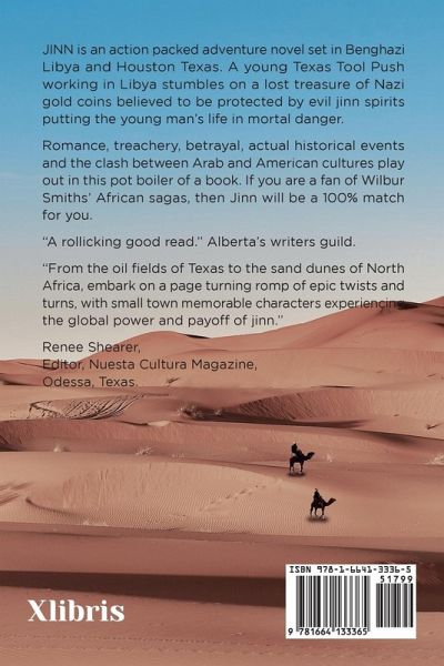 JINN is an action packed adventure novel set in Benghazi Libya and Houston Texas. A young Texas Tool Push working in Libya stumbles on a lost treasure of Nazi gold coins believed to be protected by evil jinn spirits putting the young man's life in mortal danger. Romance, treachery, betrayal, actual historical events and the clash between Arab and American cultures play out in this pot boiler of a book. If you are a fan of Wilbur Smiths' African sagas, then Jinn will be a 100% match for you. "A rollicking good read." Alberta's writers guild. "From the oil fields of Texas to the sand dunes of North Africa, embark on a page turning romp of epic twists and turns, with small town memorable characters experiencing the global power and payoff of jinn."