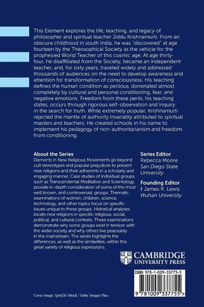 This Element explores the life, teaching, and legacy of philosopher and spiritual teacher Jiddu Krishnamurti. From an obscure childhood in south India, he was 'discovered' at age fourteen by the Theosophical Society as the vehicle for the prophesied World Teacher of this cosmic age.