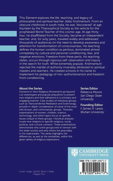 This Element explores the life, teaching, and legacy of philosopher and spiritual teacher Jiddu Krishnamurti. From an obscure childhood in south India, he was 'discovered' at age fourteen by the Theosophical Society as the vehicle for the prophesied World Teacher of this cosmic age. At age 34, he disaffiliated from the Society, became an independent teacher, and, for sixty years, traveled widely and addressed thousands of audiences on the need to develop awareness and attention for transformation of consciousness. His teaching defines the human condition as perilous, dominated almost completely by cultural and personal conditioning, fear, and negative emotions. Freedom from these perils, his teaching states, occurs through rigorous self-observation and inquiry in the search for truth. While extremely popular, Krishnamurti rejected the mantle of authority invariably attributed to spiritual masters and teachers. He created schools in his name to implement his pedagogy of non-authoritarianism and freedom from conditioning.