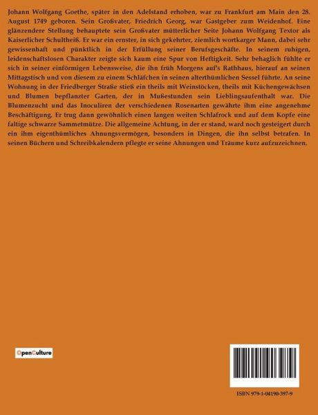 Johann Wolfgang Goethe, später in den Adelstand erhoben, war zu Frankfurt am Main den 28. August 1749 geboren. Sein Großvater, Friedrich Georg, war Gastgeber zum Weidenhof. Eine glänzendere Stellung behauptete sein Großvater mütterlicher Seite Johann Wolfgang Textor als Kaiserlicher Schultheiß. Er war ein ernster, in sich gekehrter, ziemlich wortkarger Mann, dabei sehr gewissenhaft und pünktlich in der Erfüllung seiner Berufsgeschäfte. In seinem ruhigen, leidenschaftslosen Charakter zeigte sich kaum eine Spur von Heftigkeit. Sehr behaglich fühlte er sich in seiner einförmigen Lebensweise, die ihn früh Morgens auf's Rathhaus, hierauf an seinen Mittagstisch und von diesem zu einem Schläfchen in seinen alterthümlichen Sessel führte. An seine Wohnung in der Friedberger Straße stieß ein theils mit Weinstöcken, theils mit Küchengewächsen und Blumen bepflanzter Garten, der in Mußestunden sein Lieblingsaufenthalt war. Die Blumenzucht und das Inoculiren der verschiedenen Rosenarten gewährte ihm eine angenehme Beschäftigung. Er trug dann gewöhnlich einen langen weiten Schlafrock und auf dem Kopfe eine faltige schwarze Sammetmütze. Die allgemeine Achtung, in der er stand, ward noch gesteigert durch ein ihm eigenthümliches Ahnungsvermögen, besonders in Dingen, die ihn selbst betrafen. In seinen Büchern und Schreibkalendern pflegte er seine Ahnungen und Träume kurz aufzuzeichnen.