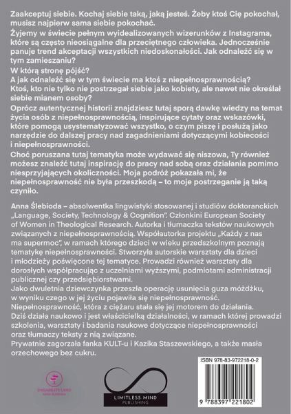 Zaakceptuj siebie. Kochaj siebie tak¿, jak¿ jeste¿. ¿eby ktö Ci¿ pokochä, musisz najpierw sama siebie pokochä. ¿yjemy w ¿wiecie pe¿nym wyidealizowanych wizerunków z Instagrama, które s¿ cz¿sto nieosi¿galne dla przeci¿tnego cz¿owieka. Jednocze¿nie panuje trend akceptacji wszystkich niedoskonäöci. Jak odnale¿¿ si¿ w tym zamieszaniu? W któr¿ stron¿ pój¿¿? A jak odnale¿¿ si¿ w tym ¿wiecie ma ktö z niepe¿nosprawnöci¿? Ktö, kto nie tylko nie postrzegä siebie jako kobiety, ale nawet nie okre¿lä siebie mianem osoby? Oprócz autentycznej historii znajdziesz tutaj spor¿ dawk¿ wiedzy na temat ¿ycia osób z niepe¿nosprawnöci¿, inspiruj¿ce cytaty oraz wskazówki, które pomog¿ wszystko usystematyzowä i pos¿ü¿ jako narz¿dzie do dalszej pracy nad zagadnieniami dotycz¿cymi kobiecöci i niepe¿nosprawnöci. Chö poruszana tematyka möe wydawä si¿ niszowa, Ty równie¿ möesz znale¿¿ tutaj inspiracj¿ do pracy nad sob¿ oraz dziäania pomimo niesprzyjaj¿cych okolicznöci. Przyjmij zaproszenie do podró¿y do wn¿trza siebie i ¿wiata, który cz¿sto bywa niezrozumiäy. Odkryj swój w¿asny szlak i zainspiruj innych do odnalezienia ich w¿asnej drogi.