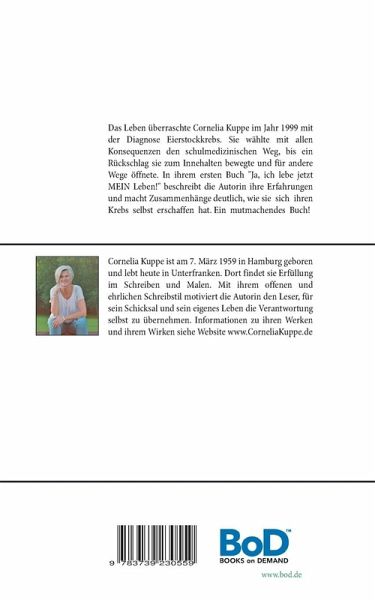 "Ja, ich lebe jetzt mein Leben!" lautet der Titel des ersten Buches der Autorin Cornelia Kuppe. Es handelt sich hierbei um die Autobiographie einer Krebspatientin. Das Leben überraschte Cornelia Kuppe im Jahr 1999 mit der Diagnose Eierstockkrebs. Sie wählte zunächst mit allen Konsequenzen den schulmedizinischen Weg, bis ein Rückschlag sie zum Innehalten bewegte und für andere Wege öffnete. In ihrem Buch beschreibt Cornelia Kuppe ihre Erfahrungen und macht Zusammenhänge deutlich, wie sie sich ihren Krebs selbst erschaffen hat. Die Autorin motiviert den Leser, für sein Schicksal und sein eigenes Leben die Verantwortung selbst zu übernehmen. Mit der Veröffentlichung ihrer ganz persönlichen Geschichte macht sie Menschen Mut, sich und seine eigenen Bedürfnisse wichtig zu nehmen. www.CorneliaKuppe.de