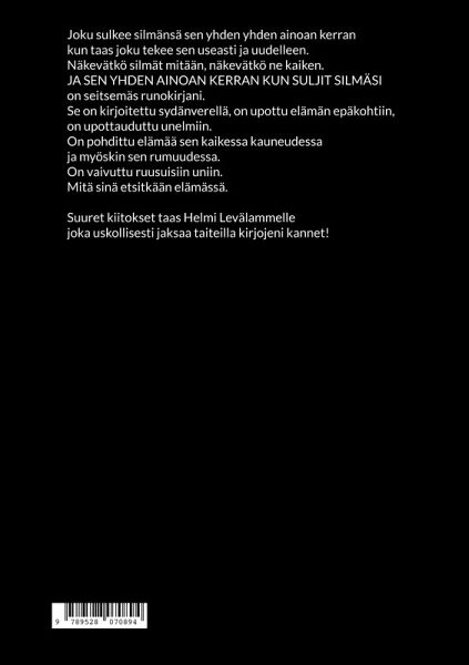 Joku sulkee silmänsä sen yhden yhden ainoan kerran kun taas joku tekee sen useasti ja uudelleen. Näkevätkö silmät mitään, näkevätkö ne kaiken. JA SEN YHDEN AINOAN KERRAN KUN SULJIT SILMÄSI on seitsemäs runokirjani. Se on kirjoitettu sydänverellä, on upottu elämän epäkohtiin, on upottauduttu unelmiin. On pohdittu elämää sen kaikessa kauneudessa ja myöskin sen rumuudessa. On vaivuttu ruusuisiin uniin. Mitä sinä etsitkään elämässä.