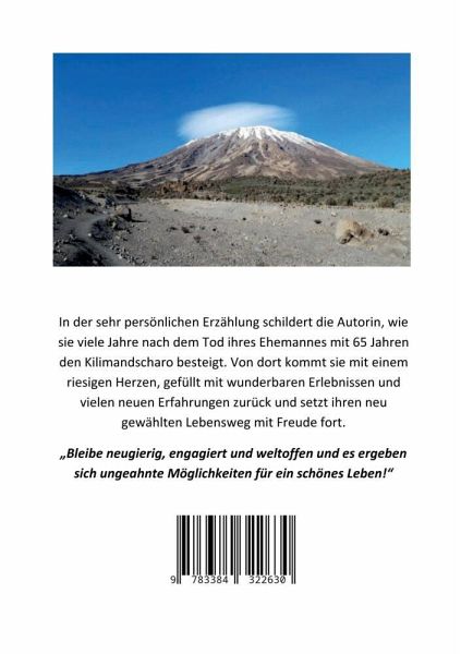 In der sehr persönlichen Erzählung schidert die Autorin, wie sie, viele Jahre nach dem Tod ihres Ehemannes, mit 65 Jahren den Kilimandscharo bestiegen hat. Von dort kommt sie mit einem riesigen Herzen, gefüllt mit wunderbaren Erlebnissen und vielen neuen Erfahrungen zurück und setzt ihren neu gewählten Lebensweg mit Freude fort.