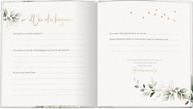 Viel Platz für Fotos und Erinnerungen: Das erste Kennenlernen, der Trauspruch, die Einladungskarte, das Menü oder die Wünsche der Gäste - alles Wichtige kann auf den liebevoll gestalteten Ausfüllseiten verewigt werden. Ergänzt wird das Album durch herzerwärmende Texte von Katja Heimberg, die das Brautpaar auf seinem Weg begleiten.