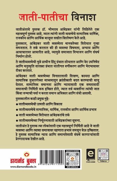 Dr. Bhimrao Ambedkar wrote the book 'Destruction of Caste'. In it, he narrates an in-depth analysis of the social, religious, political, and economic aspects of the caste system. Ambedkar considers the caste system a crime against humanity in the book. He argues that this system is based on inequality, injustice and oppression, leading to social division and conflict. He traces the roots of the caste system to ancient Hindu texts and criticizes the caste classification and discrimination mentioned in texts such as the Vedas, Upanishads and Manusmriti. For the destruction of the caste system, Ambedkar advocates revolutionary change through education, law and social reforms. He wants to create an egalitarian society for social equality and justice in which all individuals have equal rights and opportunities irrespective of caste or birth. Some key points of the book: ¿ Origin and development of the caste system ¿ Social, religious, political and economic effects of caste system ¿ Ambedkar's arguments against the caste system ¿ Ambedkar's suggestions for the abolition of the caste system. 'Destruction of Caste' narrates about the caste system and its effects on society. This book is a source of inspiration for those who struggle for social justice and equality.