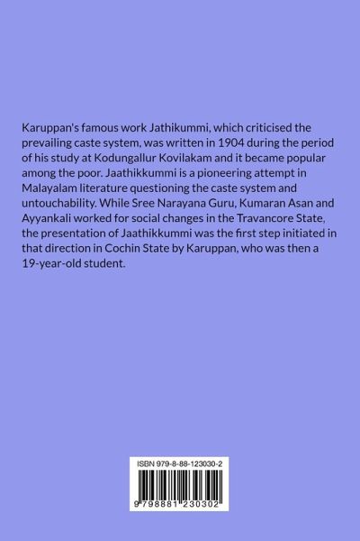 Jaathikkummi is a pioneering attempt in Malayalam literature questioning the caste system and untouchability. While Sree Narayana Guru, Kumaran Asan and Ayyankali worked for social changes in the Travancore State, the presentation of Jaathikkummi was the first step initiated in that direction in Cochin State by Karuppan, who was then a 19-year-old student.