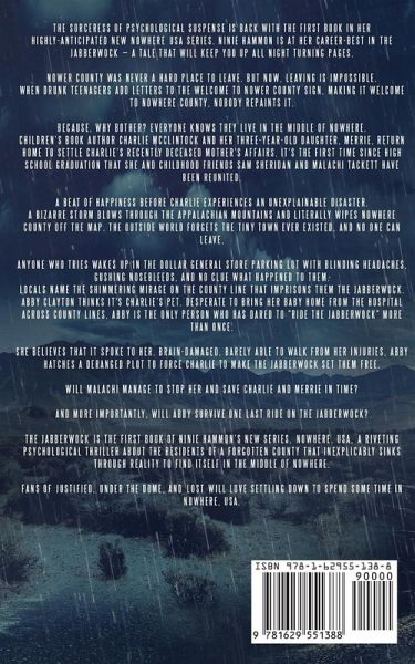 The sorceress of psychological suspense is back with the first book in her highly-anticipated new Nowhere USA series. Ninie Hammon is at her career-best in Jabberwock - a tale that will keep you up all night turning pages. Nower County was never a hard place to leave. Now, leaving is impossible. When drunk teenagers add letters to the Welcome to Nower County sign, making it Welcome to NowHerE County, nobody repaints it. Why bother? Everyone knows they live in the middle of nowhere. Children's book author Charlie McClintock and her three-year-old daughter, Merrie, return home to settle Charlie's recently deceased mother's affairs. It's the first time since high school that she and childhood friends Sam Sheridan and Malachi Tackett have been reunited. A beat of happiness before Charlie experiences an unexplainable disaster. A bizarre storm blows through the Appalachian Mountains and literally wipes Nowhere County off the map. The outside world forgets the tiny town ever existed, and no one can leave. Anyone who tries wakes up in the Dollar General Store parking lot with blinding headaches, gushing nosebleeds, and no clue what happened to them. Locals name the shimmering mirage on the county line that imprisons them the Jabberwock. Abby Clayton thinks it's Charlie's pet. Desperate to bring her baby home from the hospital across county lines, Abby is the only person who has dared to "ride the Jabberwock" more than once. She believes it spoke to her. Brain-damaged, barely able to walk from her injuries, Abby hatches a deranged plot to force Charlie to make the Jabberwock set them free. Will Malachi manage to stop her and save Charlie and Merrie in time? And can Abby survive one more ride on the Jabberwock? Jabberwock is the first book of Ninie Hammon's new series, Nowhere USA, a riveting psychological thriller about the residents of a forgotten county that inexplicably sinks through reality to find itself in the middle of Nowhere. Fans of Justified, Under The Dome, and LOST will love settling down to spend some time in Nowhere USA.