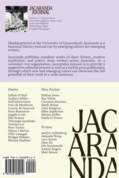 Headquartered at the University of Queensland, Jacaranda is a biannual literary journal run by emerging editors for emerging writers. Jacaranda publishes standout works of short fiction, creative nonfiction, and poetry from writers across Australia. In this edition, contributors respond in a variety of creative ways to the theme of Exposed Roots. From poetic meditations on interconnectedness, to creative non-fiction exploring evolving cityscapes, to short fiction that narrates the challenging adaptations undertaken by immigrant communities, each of the 29 contributions resonates with the theme in its own surprising and unique way.