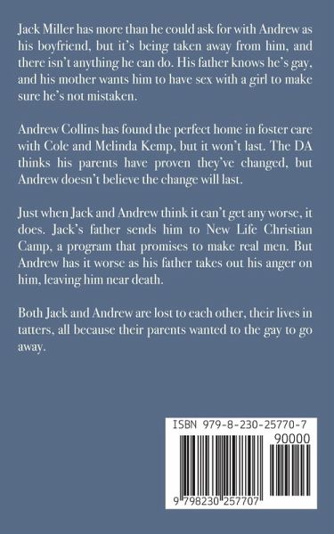 Jack Miller has more than he could ask for with Andrew as his boyfriend, but it's being taken away from him, and there isn't anything he can do. His father knows he's gay, and his mother wants him to have sex with a girl to make sure he's not mistaken. Andrew Collins has found the perfect home in foster care with Cole and Melinda Kemp, but it won't last. The DA thinks his parents have proven they've changed, but Andrew doesn't believe the change will last. Just when Jack and Andrew think it can't get any worse, it does. Jack's father sends him to New Life Christian Camp, a program that promises to make real men. But Andrew has it worse as his father takes out his anger on him, leaving him near death. Both Jack and Andrew are lost to each other, their lives in tatters, all because their parents wanted to the gay to go away.