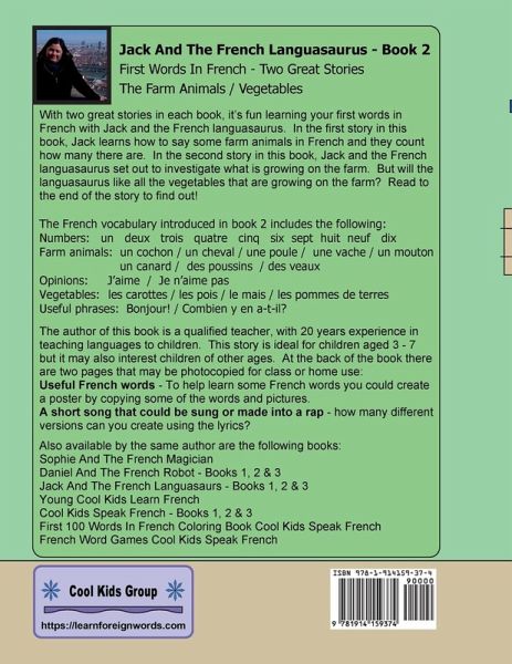 With two great stories in each book, it's fun learning your first words in French with Jack and the French languasaurus. In the first story in this book, Jack learns how to say some farm animals in French and they count how many there are. In the second story in this book, Jack and the French languasaurus set out to investigate what is growing on the farm. But will the languasaurus like all the vegetables that are growing on the farm? Read to the end of the story to find out! The French vocabulary introduced in book 2 includes the following:Numbers: un deux trois quatre cinq six sept huit neuf dix Farm animals: un cochon / un cheval / une poule / une vache / un mouton / un canard / des poussins / des veaux Opinions: J'aime / Je n'aime pas Vegetables: des légumes / les carottes / les pois / le mais / les pommes de terres Useful phrases: Bonjour! / Combien y en a-t-il? The author of this book is a qualified teacher, with 20 years experience in teaching languages to children. This story is ideal for children aged 3 - 7 but it may also interest children of other ages. At the back of the book there are two pages that may be photocopied for class or home use:Useful French words - To help learn some French words you could create a poster by copying some of the words and pictures. A short song that could be sung or made into a rap - how many different versions can you create using the lyrics? Also available by the same author are the following books:Sophie And The French Magician Daniel And The French Robot (books 1, 2 & 3) Jack And The French Languasaurus (books 1,2 & 3) Young Cool Kids Learn French Cool Kids Speak French (books 1, 2 & 3) First 100 Words In French Coloring Book Cool Kids Speak French French Word Games