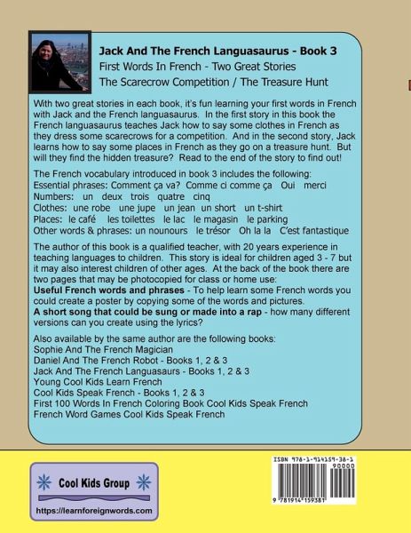 With two great stories in each book, it's fun learning your first words in French with Jack and the French languasaurus. In the first story in this book the French languasaurus teaches Jack how to say some clothes in French as they dress some scarecrows for a competition. And in the second story, Jack learns how to say some places in French as they go on a treasure hunt. But will they find the hidden treasure? Read to the end of the story to find out! The French vocabulary introduced in book 3 includes the following:Essential phrases: Comment ça va? / Comme ci comme ça / Oui / merci Numbers: un deux trois quatre cinq Clothes: une robe / une jupe / un jean / un short / un t-shirt Places: le café / les toilettes / le lac / le magasin / le parking Other words & phrases: un nounours / le trésor / Oh la la / C'est fantastique The author of this book is a qualified teacher, with 20 years experience in teaching languages to children. This story is ideal for children aged 3 - 7 but it may also interest children of other ages. At the back of the book there are two pages that may be photocopied for class or home use:Useful French words and phrases - To help learn some French words you could create a poster by copying some of the words and pictures. A short song that could be sung or made into a rap - how many different versions can you create using the lyrics? Also available by the same author are the following books:Sophie And The French Magician Daniel And The French Robot (Books 1, 2 & 3) Jack And The French Languasaurus (Books 1, 2 & 3) Young Cool Kids Learn French Cool Kids Speak French (Books 1, 2 & 3) First 100 Words In French Coloring Book Cool Kids Speak French French Word Games Cool Kids Speak French