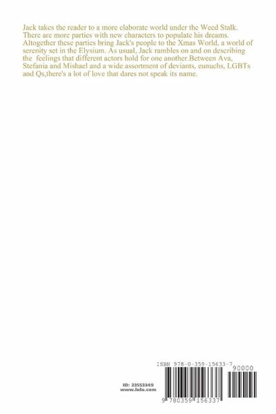 Jack takes the reader to a more elaborate world under the Weed Stalk. The are more parties with new characters to populate his dreams. Altogether these parties bring Jack's people to the Xmas World, a world of serenity set in the Elysium. As usual, Jack rambles on and on describing the feelings that different actors hold for one another. Between Ava, Stefania, Mishael and a wide assortment of deviants, eunuchs, LGBTs and Qs, there's a lot of love that dares not speak its name.