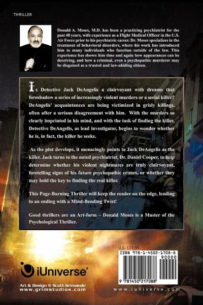 Is Detective Jack DeAngelis a clairvoyant with dreams that foreshadow a series of increasingly violent murders or a serial killer? DeAngelis' acquaintances are being victimized in grisly killings, often after a serious disagreement with him. With the murders so clearly imprinted in his mind, and with the task of finding the killer, Detective DeAngelis, as lead investigator, begins to wonder whether he is, in fact, the killer he seeks. As the plot develops, it menacingly points to Jack DeAngelis as the killer. Jack turns to the noted psychiatrist, Dr. Daniel Cooper, to help determine whether his violent nightmares are truly clairvoyant, foretelling signs of his future psychopathic crimes, or whether they may hold the key to finding the real killer. This Page-Burning Thriller will keep the reader on the edge, leading to an ending with a Mind-Bending Twist! Good thrillers are an Art-form - Donald Moses is a Master of the Psychological Thriller.