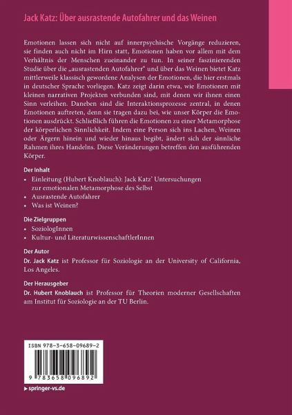 Emotionen lassen sich nicht auf innerpsychische Vorgänge reduzieren, sie finden auch nicht im Hirn statt, Emotionen haben vor allem mit dem Verhältnis der Menschen zueinander zu tun. In seiner faszinierenden Studie über die "ausrastenden Autofahrer" und über das Weinen bietet Katz mittlerweile klassisch gewordene Analysen der Emotionen, die hier erstmals in deutscher Sprache vorliegen. Katz zeigt darin etwa, wie Emotionen mit kleinen narrativen Projekten verbunden sind, mit denen wir ihnen einen Sinn verleihen. Daneben sind die Interaktionsprozesse zentral, in denen Emotionen auftreten, denn sie tragen dazu bei, wie unser Körper die Emotionen ausdrückt. Schließlich führen die Emotionen zu einer Metamorphose der körperlichen Sinnlichkeit. Indem eine Person sich ins Lachen, Weinen oder Ärgern hinein und wieder hinaus begibt, ändert sich der sinnliche Rahmen ihres Handelns. Diese Veränderungen betreffen den ausführenden Körper.