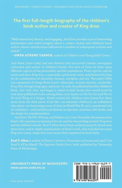 Jack Kent (1920-1985) had two distinct and successful careers: newspaper cartoonist and author of children's books. For each of these he drew upon different aspects of his personality and life experiences. From 1950 to 1965 he wrote and drew King Aroo, a nationally syndicated comic strip beloved by fans for its combination of absurdity, fantasy, wordplay, and wit. The strip's DNA was comprised of things Kent loved--fairytales, nursery rhymes, vaudeville, Krazy Kat, foreign languages, and puns. In 1968, he published his first children's book, Just Only John, and began a career in kids' books that would result in over sixty published works, among them such classics as The Fat Cat and There's No Such Thing as a Dragon. Kent's stories for children were funny but often arose from the dark parts of his life--an itinerant childhood, an unfinished education, two harrowing tours of duty in World War II, and a persistent lack of confidence--and tackled such themes as rejection, isolation, self-doubt, and the desire for transformation. Jack Kent: The Wit, Whimsy, and Wisdom of a Comic Storyteller illuminates how Kent's life experiences informed his art and his storytelling in both King Aroo and his children's books. Paul V. Allen draws from archival research, brand-new interviews, and in-depth examinations of Kent's work. Also included are many King Aroo comic strips that have never been reprinted in book form.