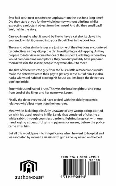 Ever had to sit next to someone unpleasant on the bus for a long time? Did they stare at you for the whole journey without blinking, whilst extracting a reluctant object from their nose? And did they smell bad? Well, he's in the story. Can you imagine what it would be like to have a cat sink its claws into your neck whilst it gnawed into your throat? He's in the book too. These and other similar issues are just some of the situations encountered by detectives as they dig up the dirt investigating a kidnapping. As they prepare to interview acquaintances of the suspect (Jack King) where they would compare times and places, they couldn't possibly have prepared themselves for the insane people they were about to meet. The first of these was 'the guy from the bus,' a little retarded and would make the detectives earn their pay to get any sense out of him. He also had a whimsical habit of blowing his house up, lets hope the detectives don't go inside. Enter vicious red haired brute. This was the local neighbour and extra from Lord of the Rings and her name was Laurel. Finally the detectives would have to deal with the elderly eccentric relatives who'd lost more than their marbles. Meanwhile Jack King blissfully unaware of any wrong doing, carried on with his usual routine in life. Lately that consisted of chasing a white rabbit through countless gardens, fighting large cat with one hand, ogling at beautiful girls in pyjamas or nurses, before the police came after him. But all this would pale into insignificance when he went to hospital and was accosted by woman assassin with gun as he lay naked on the bed.