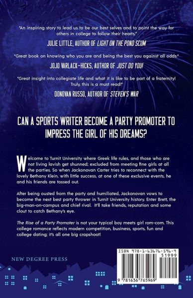 Can a sports writer become a party promoter to impress the girl of his dreams? Welcome to Turnit University where Greek life rules, and those who are not living lavish get shunned; excluded from meeting fine girls at all the parties. So when Jackonovan Carter tries to reconnect with the lovely Bethany Klein, with little success, at one of these exclusive events, he and his friends are tossed out. After being ousted from the party and humiliated, Jackonovan vows to become the next best party thrower in Turnit University history. Enter Brett, the big-man-on-campus and chief rival. It'll take friends, reputation and some clout to catch Bethany's eye. Rise of a Party Promoter is not your typical boy meets girl rom-com. This college romance reflects modern competition, business, sports, fun and college dating; it's all one big crapshoot!