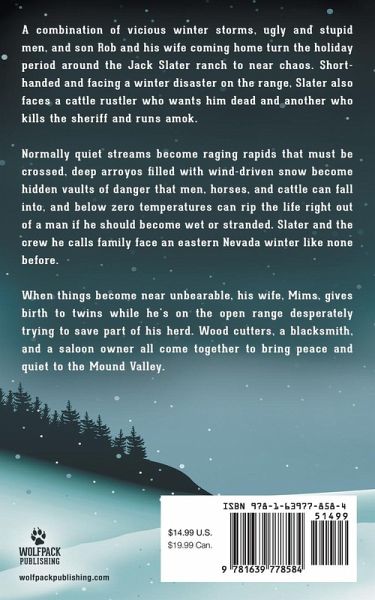 "A combination of vicious winter storms, ugly and stupid men, and son Rob and his wife coming home turn the holiday period around the Jack Slater ranch to near chaos. Short-handed and facing a winter disaster on the range, Slater also faces a cattle rustler who wants him dead and another cattle rustler who kills the sheriff and runs amok. Normally quiet streams become raging water courses that must be crossed, deep arroyos are filled with wind driven snow, become hidden vaults of danger that men, horses, and cattle can fall into, and below zero temperatures can rip the life right out of a man if he should become wet or stranded. Slater and his crew that he calls family, face an eastern Nevada winter like none other before. When things become almost more than the big man can handle, his wife, Mims, gives birth to twins while he's on the open range desperately trying to save part of his herd. Wood cutters, a blacksmith, and a saloon owner all come together to bring peace and quiet to the Mound Valley. Ugly, mean, and stupid men are responsible for many deaths, for creating an atmosphere of fear and anxiety, and in the final analysis, pay the ultimate price"--
