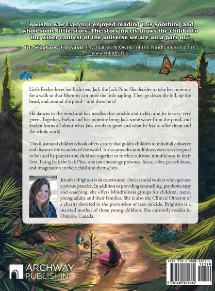 Little Evelyn loves her little tree, Jack the Jack Pine. She decides to take her mommy for a walk so that Mommy can meet the little sapling. They go down the hill, up the bend, and around the pond-and there he is! He dances in the wind and has needles that prickle and tickle, and he is very, very green. Together, Evelyn and her mommy bring Jack some water from the pond, and Evelyn learns all about what Jack needs to grow and what he has to offer them and the whole world. This illustrated children's book offers a story that guides children to mindfully observe and discover the wonders of the world. It also provides mindfulness exercises designed to be used by parents and children together to further cultivate mindfulness in their lives. Using Jack the Jack Pine, one can encourage presence, focus, calm, peacefulness, and imagination in their child and themselves.