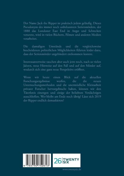 Der Name Jack the Ripper ist praktisch jedem geläufig. Dieses Pseudonym des immer noch unbekannten Serienmörders, der 1888 das Londoner East End in Angst und Schrecken versetzte, wird in vielen Büchern, Filmen und anderen Medien verarbeitet. Die damaligen Umstände und die vergleichsweise bescheidenen polizeilichen Möglichkeiten führten leider dazu, dass der Serienmörder ungehindert entkommen konnte. Interessanterweise tauchen aber auch jetzt noch, nach so vielen Jahren, neue Hinweise auf den Fall und auf den Mörder auf, wodurch sich eine ganz neue Perspektive eröffnet. Wenn wir heute einen Blick auf die aktuellen Forschungsergebnisse werfen, die die neuen Untersuchungsmethoden und die unermüdliche Kleinarbeit privater Forscher hervorgebracht haben, können wir den Täterkreis einengen und einige der beliebten Verdächtigen ausschließen. Wer bleibt am Ende noch übrig? Lässt sich 2019 der Ripper endlich demaskieren?