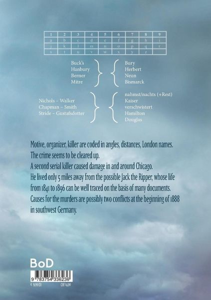 Motive, organizer, killer are coded in angles, distances, London names.The crime seems to be cleared up.A second serial killer caused damage in and around Chicago.He lived only 5 miles away from the possible Jack the Ripper, whose lifefrom 1841 to 1896 can be well traced on the basis of many documents.Causes for the murders are possibly two conflicts at the beginning of 1888 in southwest Germany.