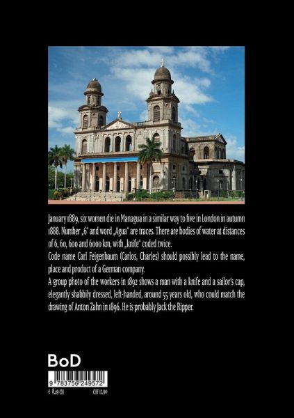 January 1889, six women die in Managua in a similar way to five in London in autumn 1888. Number "6" and word "Agua" are traces. There are bodies of water at distances of 6, 60, 600 and 6000 km, with "knife" coded twice.Code name Carl Feigenbaum (Carlos, Charles) should possibly lead to the name, place and product of a German company.A group photo of the workers in 1892 shows a man with a knife and a sailor's cap, elegantly shabbily dressed, left-handed, around 55 years old, who could match the drawing of Anton Zahn in 1896. He is probably Jack the Ripper.