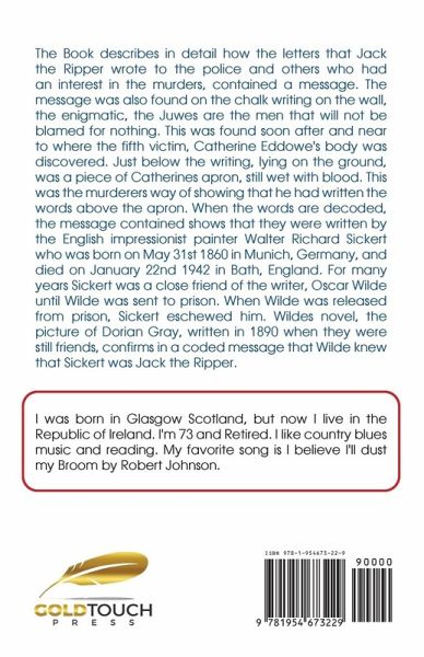 The Book describes in detail how the letters that Jack the Ripper wrote to the police and others who had an interest in the murders, contained a message. The message was also found on the chalk writing on the wall, the enigmatic, the Juwes are the men that will not be blamed for nothing. This was found soon after and near to where the fifth victim, Catherine Eddowe's body was discovered. Just below the writing, lying on the ground, was a piece of Catherines apron, still wet with blood. This was the murderers way of showing that he had written the words above the apron. When the words are decoded, the message contained shows that they were written by the English impressionist painter Walter Richard Sickert who was born on May 31st 1860 in Munich, Germany, and died on January 22nd 1942 in Bath, England. For many years Sickert was a close friend of the writer, Oscar Wilde until Wilde was sent to prison. When Wilde was released from prison, Sickert eschewed him. Wildes novel, the picture of Dorian Gray, written in 1890 when they were still friends, confirms in a coded message that Wilde knew that Sickert was Jack the Ripper.
