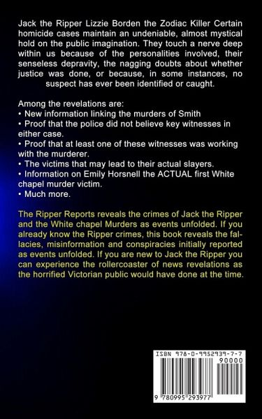 Jack the Ripper Lizzie Borden the Zodiac Killer Certain homicide cases maintain an undeniable, almost mystical hold on the public imagination. They touch a nerve deep within us because of the personalities involved, their senseless depravity, the nagging doubts about whether justice was done, or because, in some instances, no suspect has ever been identified or caught. Among the revelations are:New information linking the murders of Smith Proof that the police did not believe key witnesses in either case. Proof that at least one of these witnesses was working with the murderer. The victims that may lead to their actual slayers. Information on Emily Horsnell the ACTUAL first White chapel murder victim. Much more. The Ripper Reports reveals the crimes of Jack the Ripper and the White chapel Murders as events unfolded. If you already know the Ripper crimes, this book reveals the fallacies, misinformation and conspiracies initially reported as events unfolded. If you are new to Jack the Ripper you can experience the rollercoaster of news revelations as the horrified Victorian public would have done at the time.