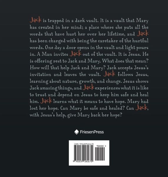 Jack is trapped in a dark vault. It is a vault that Mary has created in her mind; a place where she puts all the words that have hurt her over her lifetime, and Jack has been charged with being the caretaker of the hurtful words. One day a door opens in the vault and light pours in. A Man invites Jack out of the vault. It is Jesus. He is offering rest to Jack and Mary. What does that mean? How will that help Jack and Mary? Jack accepts Jesus's invitation and leaves the vault. Jack follows Jesus, learning about nature, growth, and change. Jesus shows Jack amazing things, and Jack experiences what it is like to trust and depend on Jesus to keep him safe and heal him. Jack learns what it means to have hope. Mary had lost her hope. Can Mary be safe and healed? Can Jack, with Jesus's help, give Mary back her hope?