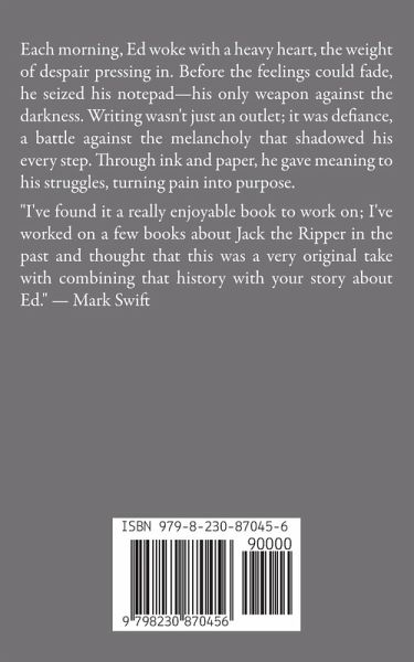 Each morning, Ed woke with a heavy heart, the weight of despair pressing in. Before the feelings could fade, he seized his notepad-his only weapon against the darkness. Writing wasn't just an outlet; it was defiance, a battle against the melancholy that shadowed his every step. Through ink and paper, he gave meaning to his struggles, turning pain into purpose. "I've found it a really enjoyable book to work on; I've worked on a few books about Jack the Ripper in the past and thought that this was a very original take with combining that history with your story about Ed." - Mark Swift