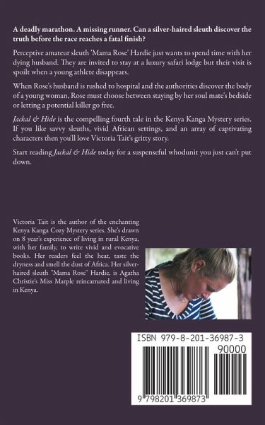 A deadly marathon. A missing runner. Can a silver-haired sleuth discover the truth before the race reaches a fatal finish? Perceptive amateur sleuth 'Mama Rose' Hardie just wants to spend time with her dying husband. They are invited to stay at a luxury safari lodge but their visit is spoilt when a young athlete disappears. When Rose's husband is rushed to hospital and the authorities discover the body of a young woman, Rose must choose between staying by her soul mate's bedside or letting a potential killer go free. Jackal & Hide is the compelling fourth tale in the Kenya Kanga Mystery series. If you like savvy sleuths, vivid African settings, and an array of captivating characters then you'll love Victoria Tait's gritty story. Start reading Jackal & Hide today for a suspenseful whodunit you just can't put down.