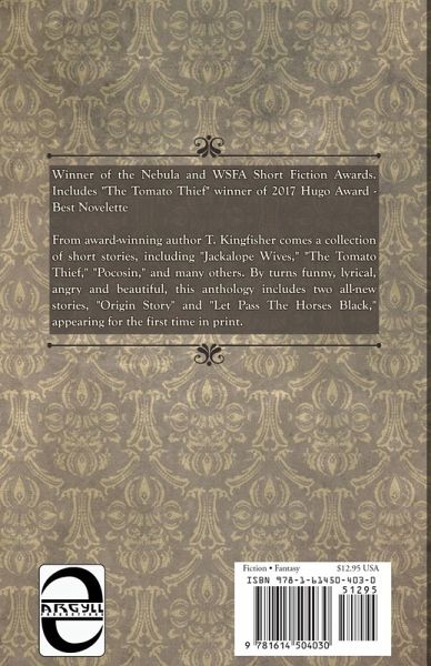 Winner of the Nebula and WSFA Short Fiction Awards. Includes "The Tomato Thief" winner of 2017 Hugo Award - Best Novelette From award-winning author T. Kingfisher comes a collection of short stories, including "Jackalope Wives," "The Tomato Thief," "Pocosin," and many others. By turns funny, lyrical, angry and beautiful, this anthology includes two all-new stories, "Origin Story" and "Let Pass The Horses Black," appearing for the first time in print.