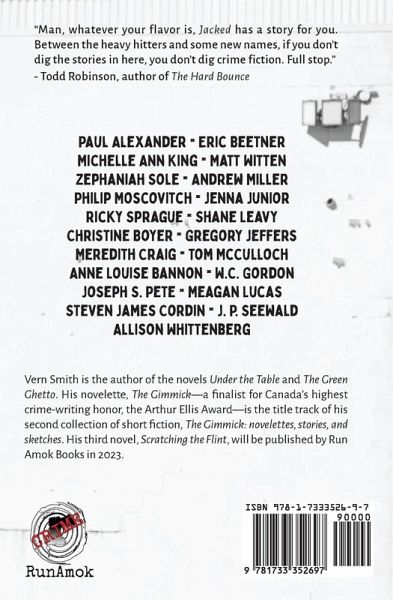 Edited by award-winning crime-fiction author Vern Smith, JACKED runs the gamut in crime fiction. From hard-boiled to humorous to gritty noir to straight-up mystery, the anthology promises to please the most diverse and discriminating reading audience. With offerings from heavy-hitters like Matt Witten, Andrew Miller, Meagan Lucas, Eric Beetner, and Allison Whittenberg, and equally impressive contributions by relative newcomers to crime fiction, like Paul Alexander, Zephaniah Sole, and Meredith Craig, JACKED is a debut anthology not to be missed.
