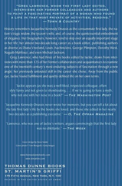 History remembers Jacqueline Kennedy Onassis as the consummate first lady, the nation's tragic widow, the tycoon's wife, and, of course, the quintessential embodiment of elegance. Her biographers, however, tend to skip over an equally important stage in her life: her almost two-decade-long career as a book editor, publishing authors as diverse as Diana Vreeland, Louis Auchincloss, George Plimpton, Dorothy West, Naguib Mahfouz, and even Michael Jackson. Greg Lawrence, who had three of his books edited by Jackie, draws from interviews with more than 125 of her former collaborators and acquaintances to examine one of the twentieth century's most enduring subjects of fascination through a new angle: her previously untouted skill in the career she chose. Away from the public eye, Jackie found fulfillment and quietly defined life on her own terms.