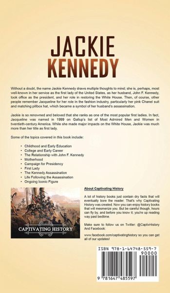 Explore the Fascinating Life of Jackie Kennedy! Without a doubt, the name Jackie Kennedy draws multiple thoughts to mind; she is, perhaps, most well-known in her service as the first lady of the United States, as her husband, John F. Kennedy, took office as the president, and her role in restoring the White House. Then, of course, other people remember Jacqueline for her role in the fashion industry, particularly her pink Chanel suit and matching pillbox hat, which became a symbol of her husband’s assassination. Jackie is so renowned and beloved that she ranks as one of the most popular first ladies. In fact, Jacqueline was named in 1999 on Gallup’s list of Most Admired Men and Women in twentieth-century America. While she made major impacts on the White House, Jackie was much more than her title as first lady. Some of the topics covered in this book include: Childhood and Early Education College and Early Career The Relationship with John F. Kennedy Motherhood Campaign for Presidency First Lady The Kennedy Assassination Life Following the Assassination Ongoing Iconic Figure And a Great Deal More that You don't Want to Miss out on! Select the add to cart button now to learn more!