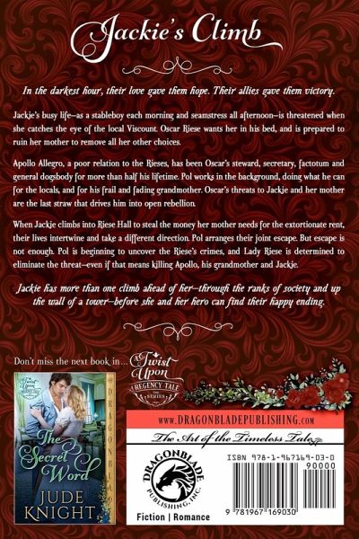 In the darkest hour, their love gave them hope. Their allies gave them victory. Jackie's busy life-as a stableboy each morning and seamstress all afternoon-is threatened when she catches the eye of the local Viscount. Oscar Riese wants her in his bed, and is prepared to ruin her mother to remove all her other choices. Apollo Allegro, a poor relation to the Rieses, has been Oscar's steward, secretary, factotum and general dogsbody for more than half his lifetime. Pol works in the background, doing what he can for the locals, and for his frail and fading grandmother. Oscar's threats to Jackie and her mother are the last straw that drives him into open rebellion. When Jackie climbs into Riese Hall to steal the money her mother needs for the extortionate rent, their lives intertwine and take a different direction. Pol arranges their joint escape. But escape is not enough. Pol is beginning to uncover the Riese's crimes, and Lady Riese is determined to eliminate the threat-even if that means killing Apollo, his grandmother and Jackie. Jackie has more than one climb ahead of her-through the ranks of society and up the wall of a tower-before she and her hero can find their happy ending. (Inspired by Jack and the Beanstalk) A Twist Upon a Regency Tale Lady Beast's Bridegroom One Perfect Dance Snowy and the Seven Doves Perchance to Dream Weave Me a Rope The Sincerest Flattery Inviting the Wild Hold Me Fast The Trials of Alaric Jackie's Climb The Teacher's Price A Gift to the Heart The Night Dancers