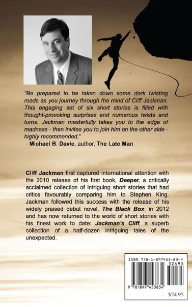 Be prepared to be taken down some dark twisting roads as you journey through the mind of Cliff Jackman. This engaging set of six short stories is filled with thought-provoking surprises and numerous twists and turns. No surprise that Jackman has been called Canada's answer to Stephen King. Jackman masterfully takes you to the edge of madness - then invites you to join him on the other side - highly recommended. - Michael Davie, author, The Late Man From the Publisher: A superb collection of a half-dozen intriguing short stories from one of Canada's best new writers, who has deservedly drawn favourable comparisons with Stephen King. A truly captivating offering and an absolute joy to read. Cliff Jackman first captured international attention with the 2010 release of his first book, Deeper, a critically acclaimed collection of intriguing short stories that had critics favourably comparing him to Stephen King. Jackman followed this success with the release of his widely praised debut novel, The Black Box, in 2012 and has now returned to the world of short stories in 2013 with what is perhaps his finest work to date: Jackman's Cliff. Cliff Jackman was born in Deep River and raised in Ottawa. He received a Bachelor's in English from York University, a Master's in English from Queen's University, and a Bachelor of Laws from Osgoode Hall Law School. The writer and practicing lawyer lives in Guelph and works in Toronto where he finds no end of inspiration for the colourful characters that populate his books.