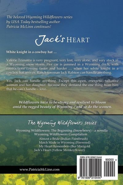 Her cowboy rescuer ... needs rescuing Valerie Trimarco is very pregnant, very lost, very alone, and very stuck in a Wyoming snow storm. Her car is jammed in a Wyoming ditch, with contractions coming faster and harder ... when her white knight in a cowboy hat arrives. Ranch foreman Jack Ralston's job is to handle anything that needs handling with cool, quiet competence, including a baby who's decided to enter the world right now. A few years later, Valerie returns to the Slash-C Ranch of Knighton, Wyoming. Now a successful mommy blogger, she wants to thank the man who rescued her and delivered her beloved daughter. Okay, maybe she's wondered about him a time or two over the years. How could she not? So she conspires with his employers and friends to spring a surprise party on him for a proper thank you. Yes, Jack can handle anything. Except a surprise party. And this open, energetic, talkative woman and her short-stuff kid who gets under his guard. Because they demand the one thing from him that he can't handle -- love. Jack's Heart brings emotional impact to this romantic comedy addition to the contemporary western romance collection Wyoming Wildflowers from award-winning and USA Today bestselling author Patricia McLinn. Wildflowers have to be strong and resilient to bloom amid the rugged beauty of Wyoming - and so do the women. Get all the blooms in the Wyoming Wildflowers series! Wyoming Wildflowers: The Beginning (Snowberry) Almost a Bride (Indian Paintbrush) Match Made in Wyoming (Fireweed) My Heart Remembers (Bur Marigold) A New World Jack's Heart (Yellow Monkeyflower) Rodeo Nights Where Love Lives (Threadleaf Phacelia) A Cowboy Wedding Making Christmas (Pasque Flower) Reader reviews for Patricia McLinn's Wyoming Wildflowers stories: "Each one was totally different, characters were unique and totally believable!! Enjoy!" "Amazing and touching story." "If you love to laugh; love to cry; or love to laugh and cry at the same time, then you'll definitely want to read Almost a Bride." "Smart, stubborn and irresistible." ... "So enjoyable I couldn't put it down until I finished it." ... "Excellent book! I read it straight in one whole day. Recommend it to anyone!" ... "Delightful!" "Nothing short of heart consuming and thrilling. I've loved every one and feel like I know the people personally. I can't wait for the next installment."