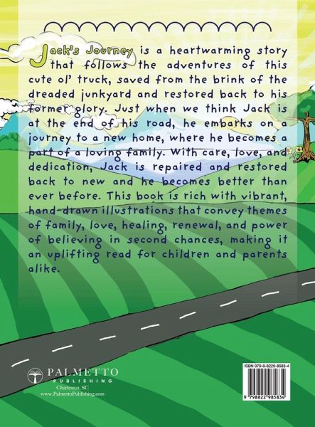 Join an old truck on an inspiring voyage to a new home, full of love and warmth. Experience a tale about healing, rejuvenation, and the magic of second chances through vibrant, hand-drawn artistry. Jack's Journey is a captivating tale that takes you along the path of a charming old truck named Jack, who is more than what he appears to be. Once perceived as a rusty, forgotten relic, Jack gets a miraculous second chance to shine. This story traces the transformation of Jack from being on the verge of abandonment to becoming the pride of a loving family. The narrative of Jack's Journey is not just about the physical restoration of an old truck but also beautifully encompasses themes of love, family, healing, and renewal. This heartwarming story emphasizes the power of love and care, as Jack is lovingly restored to a condition better than his original glory. The book is abundant with radiant, hand-crafted illustrations, which bring to life the world of Jack and his new family. Each picture speaks volumes, expressing emotions and experiences that words sometimes fail to capture. These illustrations are sure to captivate the young readers, drawing them into Jack's world and making them a part of his extraordinary journey. An important underlying message of this book is the belief in second chances. It teaches young readers that every end can be a new beginning, and that love and care can heal and renew. Jack's Journey is not just a story-it's an experience that will touch hearts and inspire young minds. In conclusion, Jack's Journey is an engaging, emotionally resonant story that will charm both children and adults. It is a celebration of love, family, and the power of second chances, making it a must-read. Let this journey of transformation and healing, wrapped in the vibrantly illustrated pages of Jack's Journey, become a cherished part of your family's reading tradition.