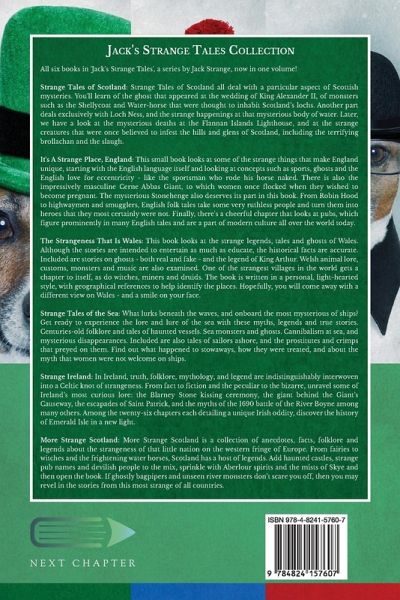 All six books in 'Jack's Strange Tales', a series by Jack Strange, now in one volume! Strange Tales of Scotland: Strange Tales of Scotland all deal with a particular aspect of Scottish mysteries. You'll learn of the ghost that appeared at the wedding of King Alexander II, of monsters such as the Shellycoat and Water-horse that were thought to inhabit Scotland's lochs. Another part deals exclusively with Loch Ness, and the strange happenings at that mysterious body of water. Later, we have a look at the mysterious deaths at the Flannan Islands Lighthouse, and at the strange creatures that were once believed to infest the hills and glens of Scotland, including the terrifying brollachan and the slaugh. It's A Strange Place, England: This small book looks at some of the strange things that make England unique, starting with the English language itself and looking at concepts such as sports, ghosts and the English love for eccentricity - like the sportsman who rode his horse naked. There is also the impressively masculine Cerne Abbas Giant, to which women once flocked when they wished to become pregnant. The mysterious Stonehenge also deserves its part in this book. From Robin Hood to highwaymen and smugglers, English folk tales take some very ruthless people and turn them into heroes that they most certainly were not. Finally, there's a cheerful chapter that looks at pubs, which figure prominently in many English tales and are a part of modern culture all over the world today. The Strangeness That Is Wales: This book looks at the strange legends, tales and ghosts of Wales. Although the stories are intended to entertain as much as educate, the historical facts are accurate. Included are stories on ghosts - both real and fake - and the legend of King Arthur. Welsh animal lore, customs, monsters and music are also examined. One of the strangest villages in the world gets a chapter to itself, as do witches, miners and druids. The book is written in a personal, light-hearted style, with geographical references to help identify the places. Hopefully, you will come away with a different view on Wales - and a smile on your face. Strange Tales of the Sea: What lurks beneath the waves, and onboard the most mysterious of ships? Get ready to experience the lore and lure of the sea with these myths, legends and true stories. Centuries-old folklore and tales of haunted vessels. Sea monsters and ghosts. Cannibalism at sea, and mysterious disappearances. Included are also tales of sailors ashore, and the prostitutes and crimps that preyed on them. Find out what happened to stowaways, how they were treated, and about the myth that women were not welcome on ships. Strange Ireland: In Ireland, truth, folklore, mythology, and legend are indistinguishably interwoven into a Celtic knot of strangeness. From fact to fiction and the peculiar to the bizarre, unravel some of Ireland's most curious lore: the Blarney Stone kissing ceremony, the giant behind the Giant's Causeway, the escapades of Saint Patrick, and the myths of the 1690 battle of the River Boyne among many others. Among the twenty-six chapters each detailing a unique Irish oddity, discover the history of Emerald Isle in a new light. More Strange Scotland: More Strange Scotland is a collection of anecdotes, facts, folklore and legends about the strangeness of that little nation on the western fringe of Europe. From fairies to witches and the frightening water horses, Scotland has a host of legends. Add haunted castles, strange pub names and devilish people to the mix, sprinkle with Aberlour spirits and the mists of Skye and then open the book. If ghostly bagpipers and unseen river monsters don't scare you off, then you may revel in the stories from this most strange of all countries.