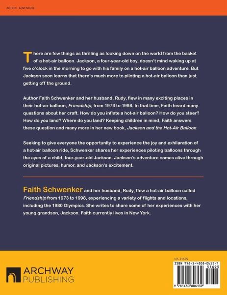 There are few things as thrilling as looking down on the world from the basket of a hot-air balloon. Jackson, a four-year-old boy, doesn't mind waking up at five o'clock in the morning to go with his family on a hot-air balloon adventure. But Jackson soon learns that there's much more to piloting a hot-air balloon than just getting off the ground. Author Faith Schwenker and her husband, Rudy, flew in many exciting places in their hot-air balloon, Friendship, from 1973 to 1998. In that time, Faith heard many questions about her craft. How do you inflate a hot-air balloon? How do you steer? How do you land? Where do you land? Keeping children in mind, Faith answers these question and many more in her new book, Jackson and the Hot-Air Balloon. Seeking to give everyone the opportunity to experience the joy and exhilaration of a hot-air balloon ride, Schwenker shares her experiences piloting balloons through the eyes of a child, four-year-old Jackson. Jackson's adventure comes alive through original pictures, humor, and Jackson's excitement.